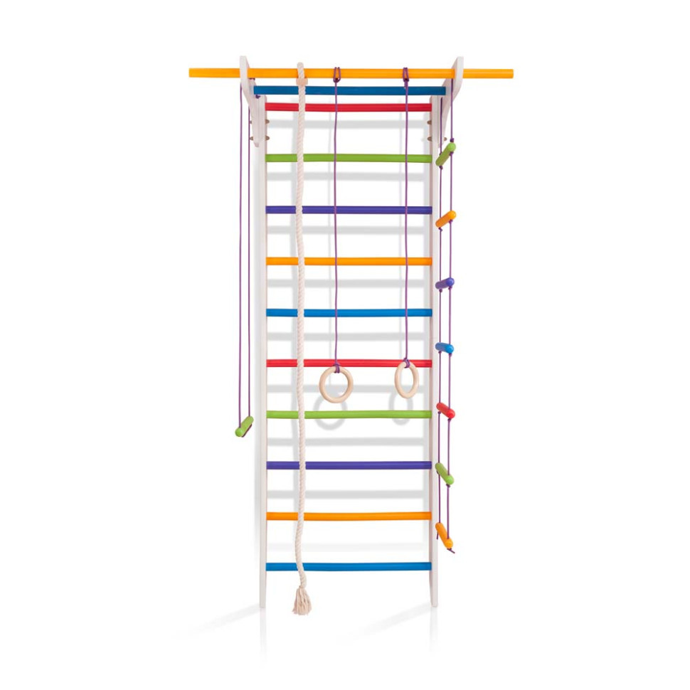 - Шведська стінка - зручний тренажер для лазіння, його обожнюють, напевно, всі діти (від року і старше). Якщо ви збираєте ДСК покроково, то для однорічної дитини шведської стінки та мату буде цілком достатньо. Інші елементи можна додавати після 2 років.