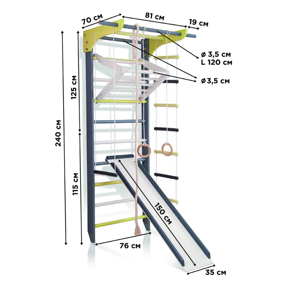| Додаткова комплектація | Турнік, Рукохід, Мотузкові сходи, Прес, Гірка, Трапеція, Кільця гімнастичні, Канат |